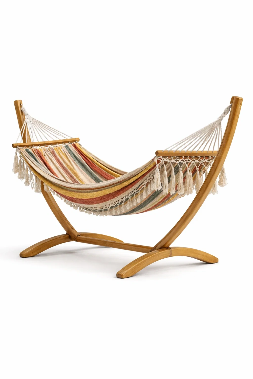 DescrizioneAmaca con struttura in legno naturale e telo in cotone a righe calde adatta a spazi esterni e interni