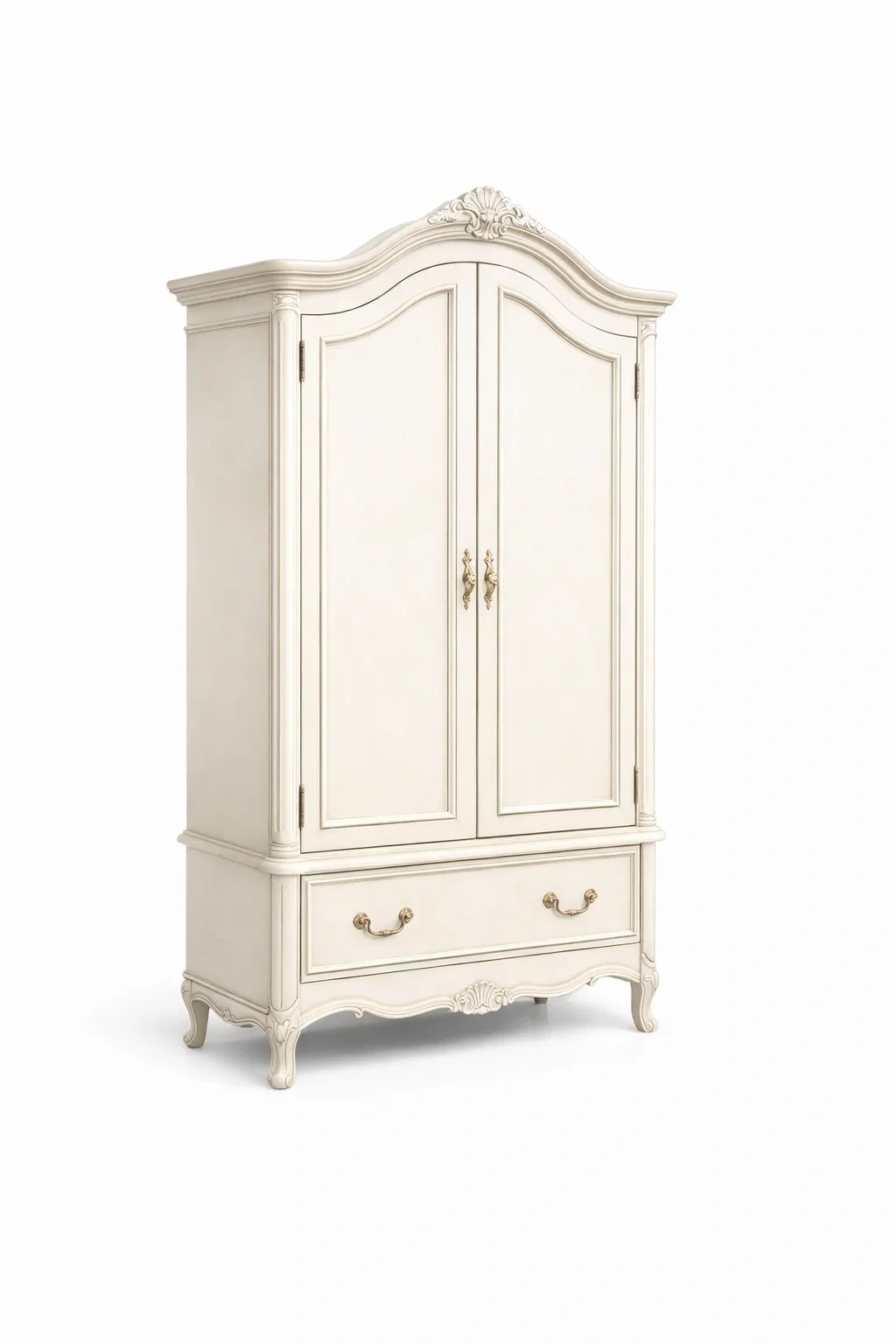DescrizioneArmadio in legno avorio con ante sagomate e cassetto inferiore ispirato allo stile tradizionale europeo