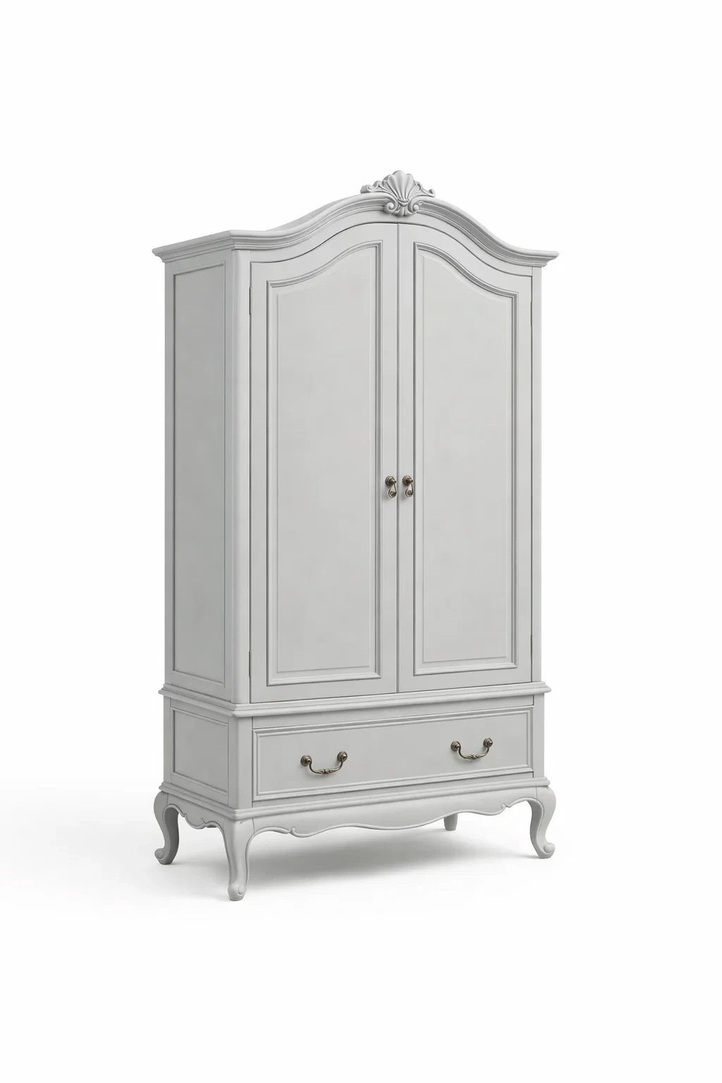 DescrizioneArmadio in legno grigio chiaro con ante sagomate base con cassetto e linee decorative di stile classico