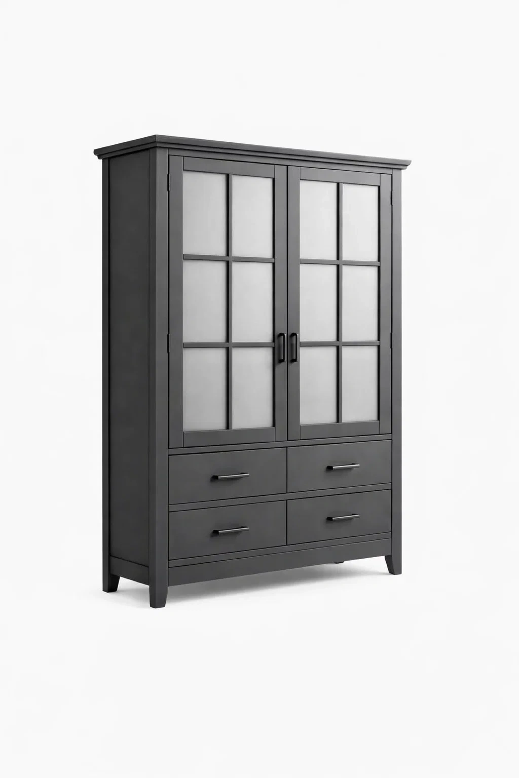 DescrizioneArmadio nero con ante vetrate cassetti inferiori e struttura solida adatto a spazi interni contemporanei