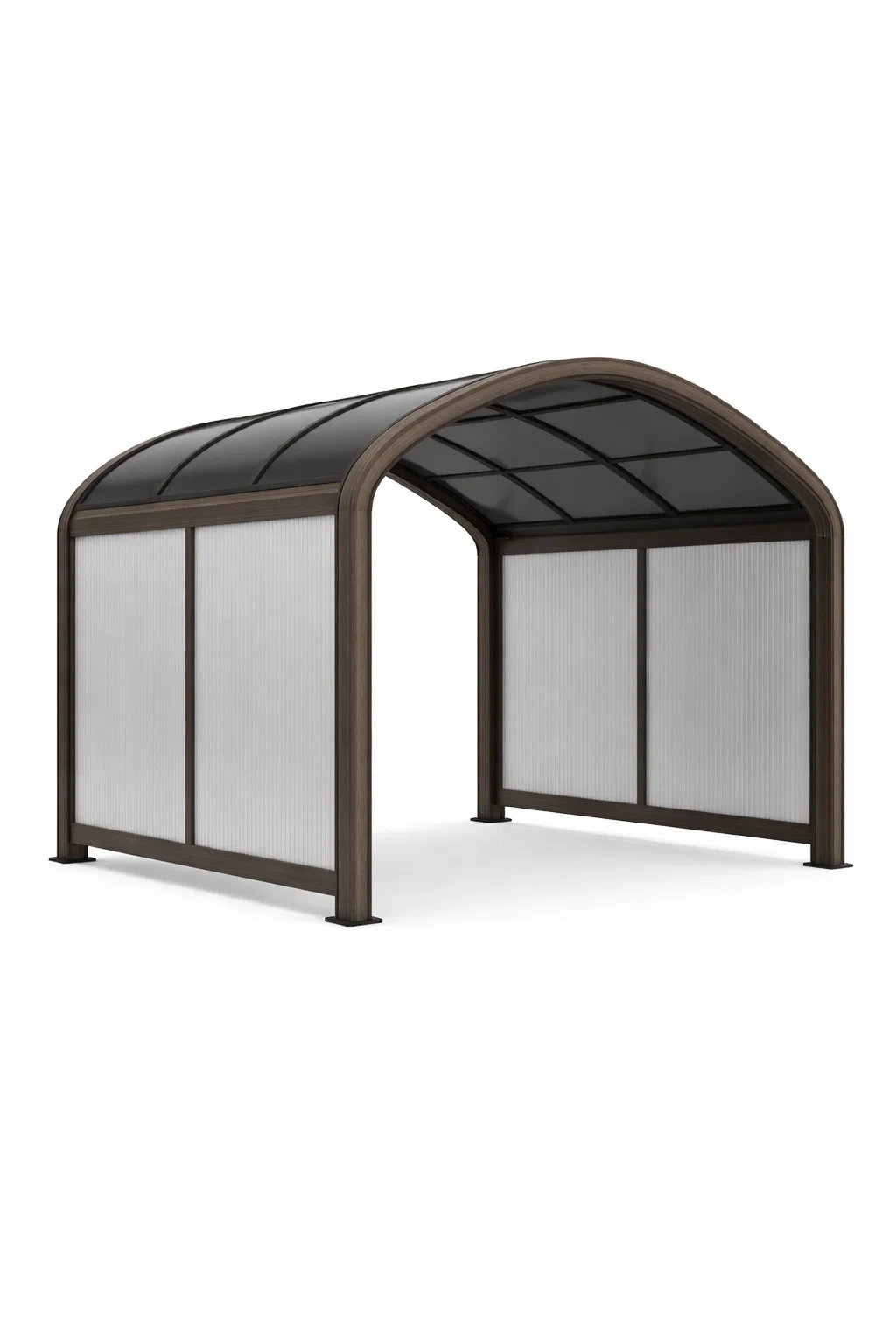 DescrizioneCarport con telaio marrone scuro e copertura curva ideale per contesti esterni dallo stile contemporaneo