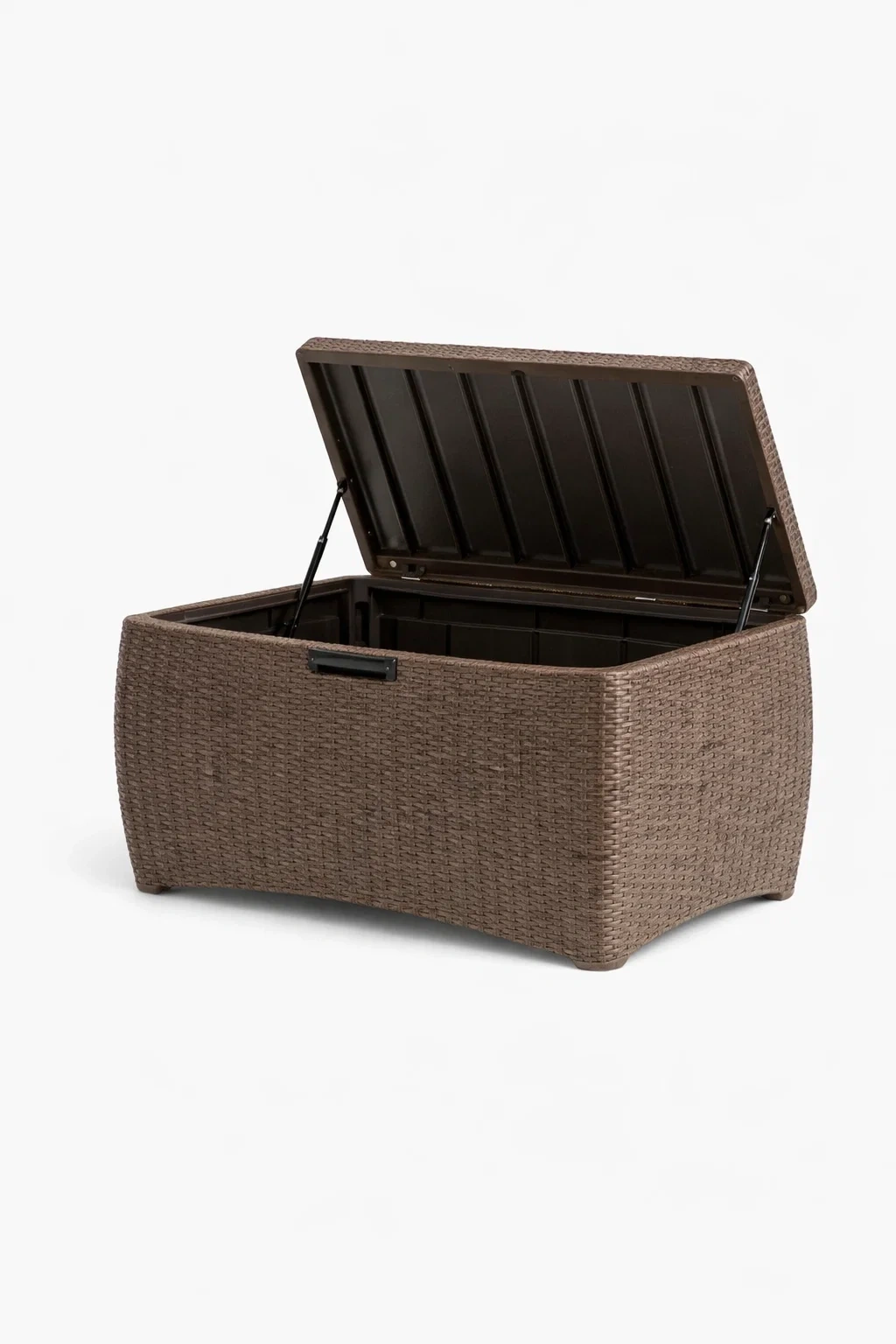 DescrizioneCassapanca in rattan sintetico grigio con trama fitta superficie solida e stile moderno uniforme
