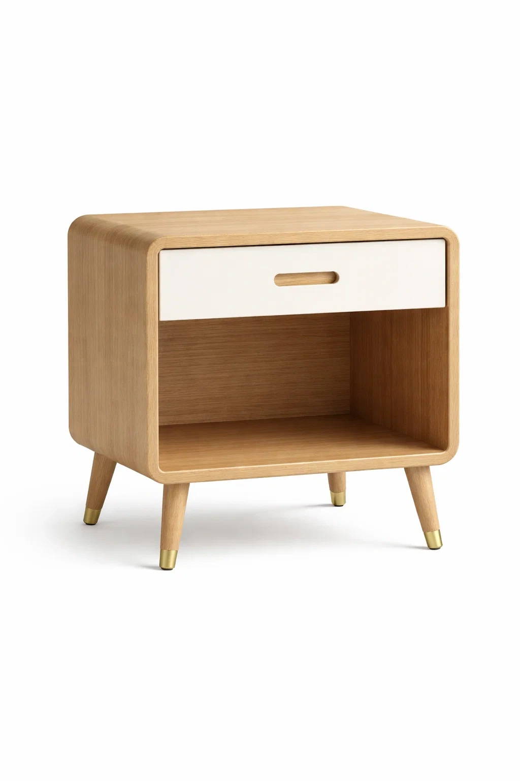 DescrizioneComodino in legno naturale con frontale chiaro forma arrotondata e vano aperto inferiore dallo stile sobrio