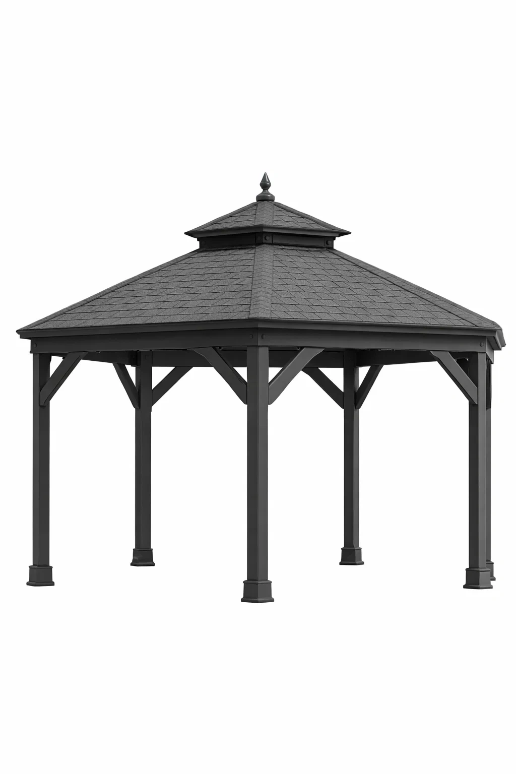 DescrizioneGazebo in legno nero con struttura solida e tetto a falde ideale per giardini spaziosi e aree esterne curate