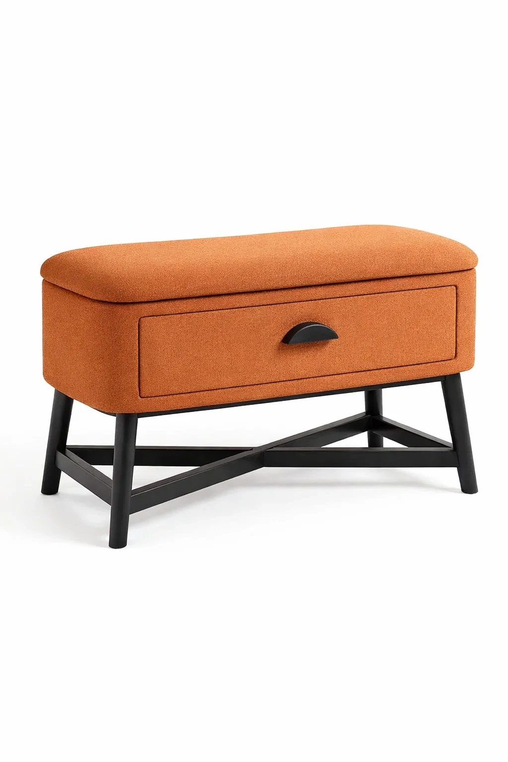 DescrizionePanca compatta rivestita in tessuto arancione con base in metallo nero e struttura interna in legno
