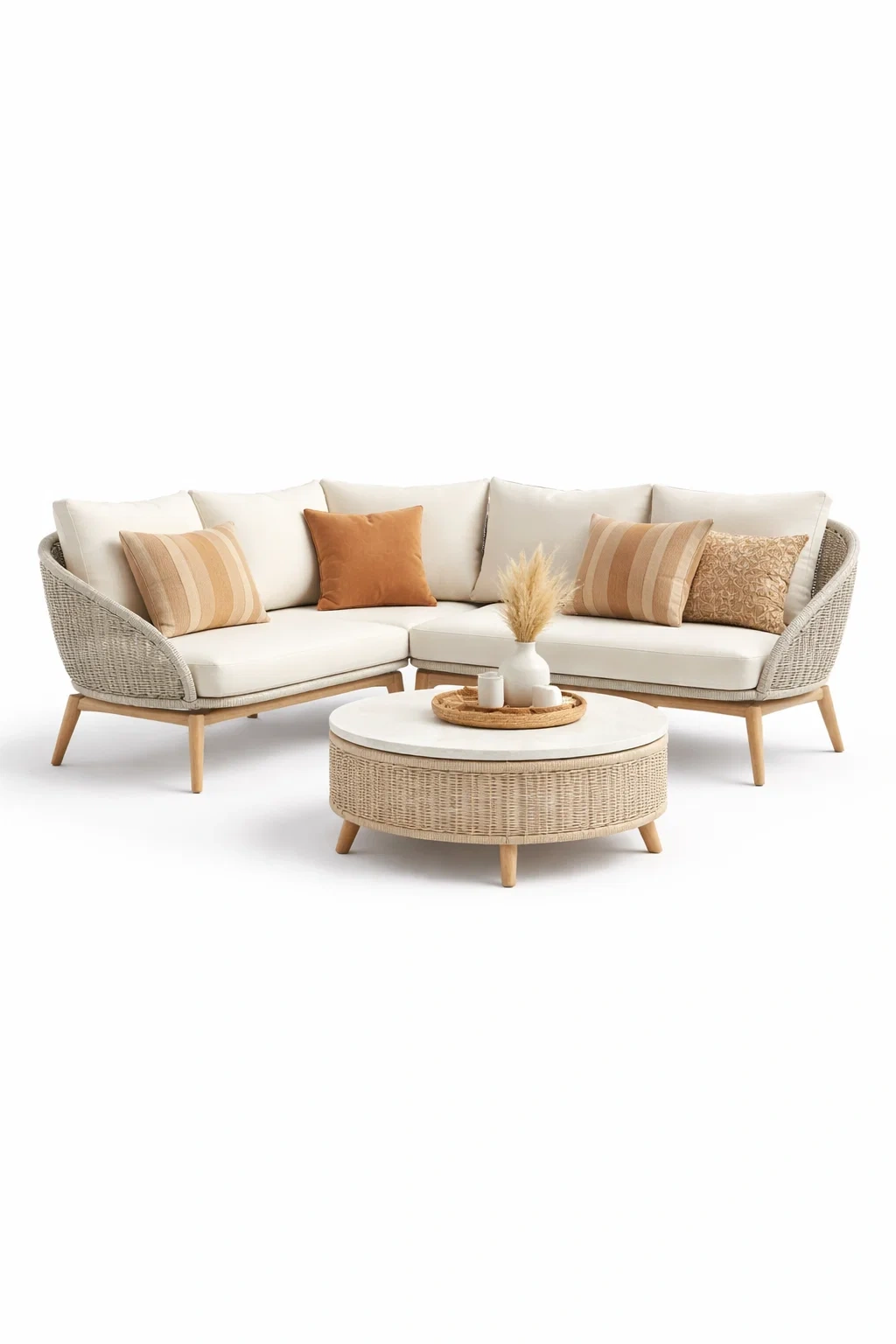 DescrizioneSet angolare in rattan chiaro con cuscini coordinati volumi avvolgenti e composizione pensata per aree lounge